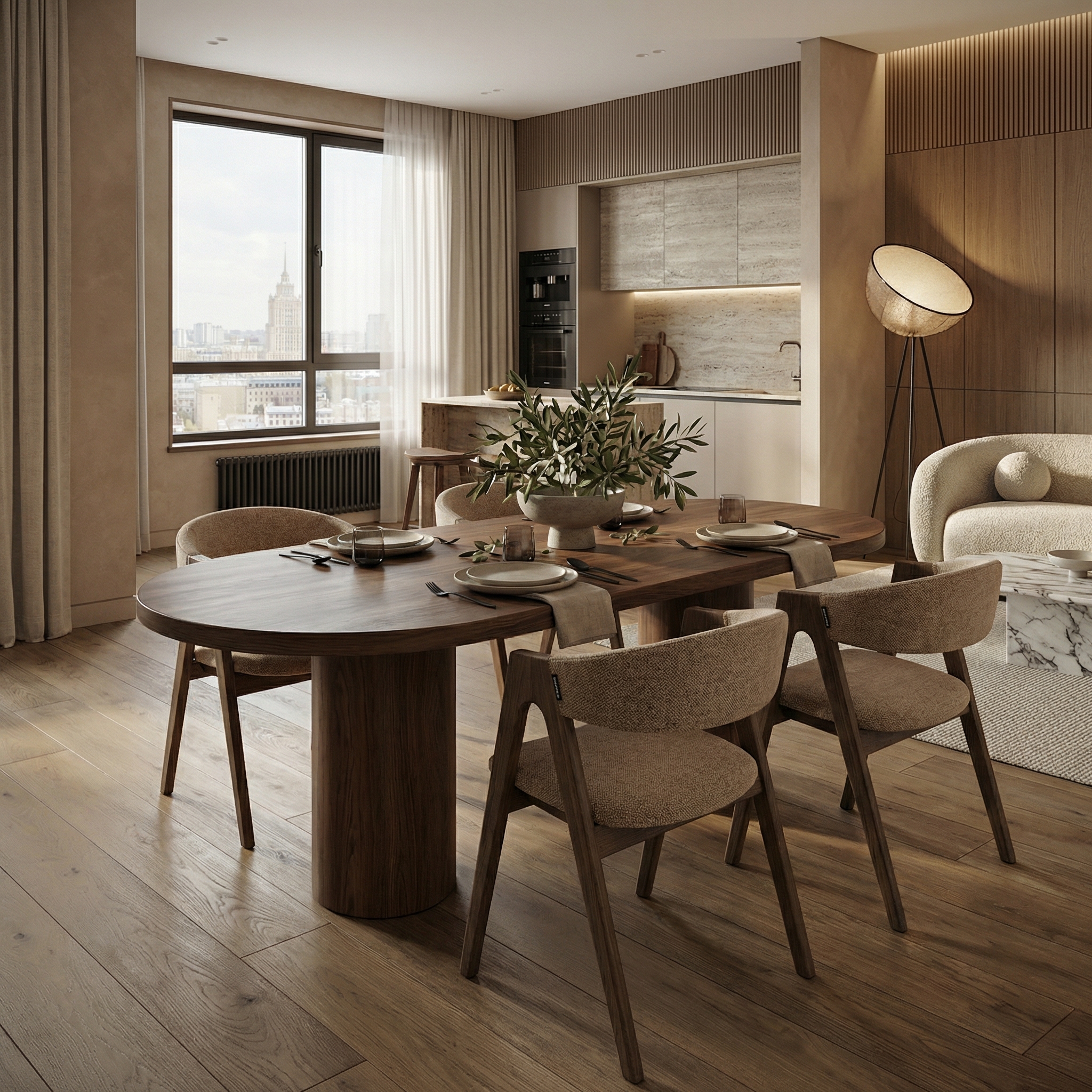 - Единое пространство: Ножки, также отделанные шпоном, не выбиваются из общей картины. Волокна дерева на цилиндрах тянутся вертикально, визуально делая потолки выше и объединяя форму в цельный, гармоничный объект.
