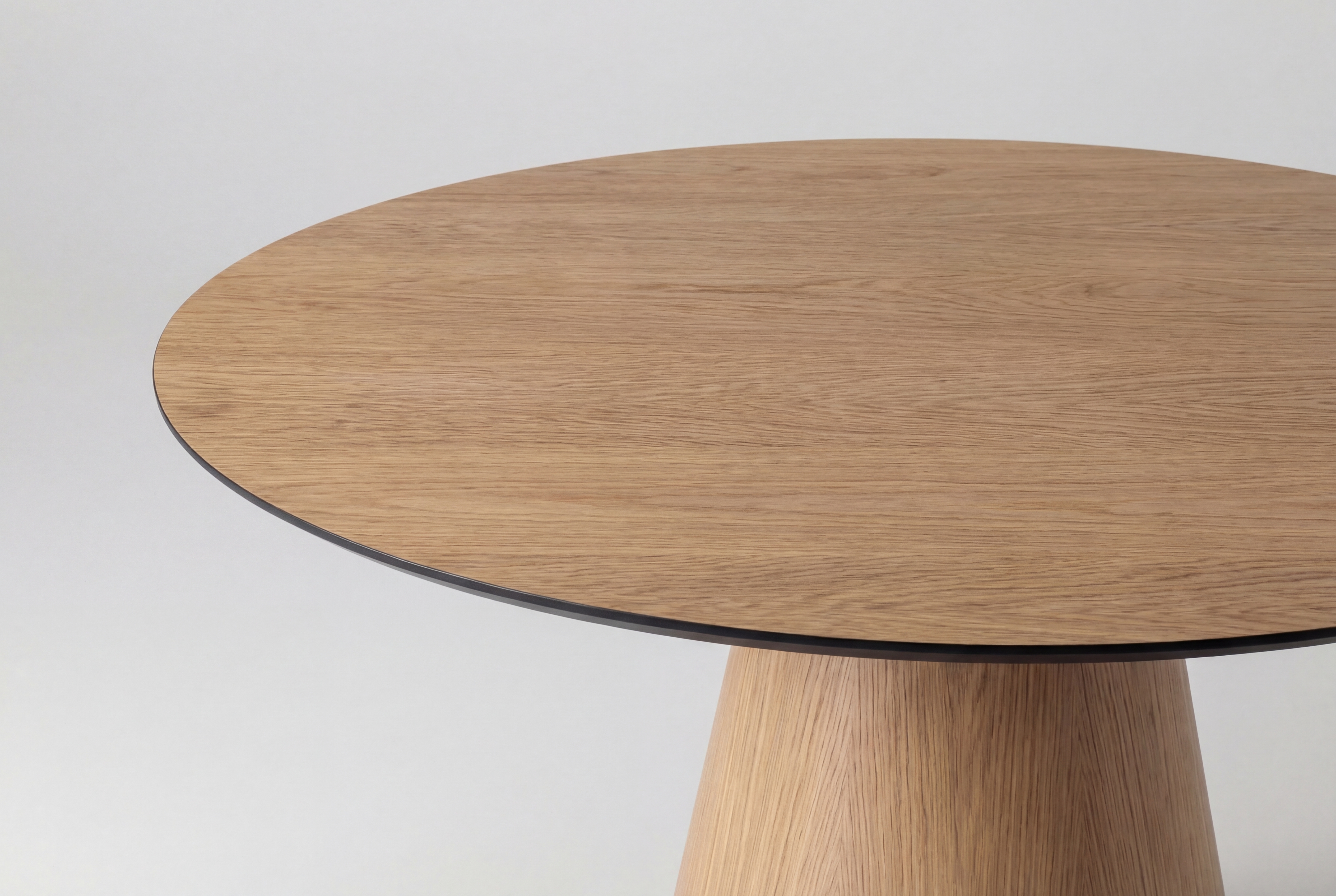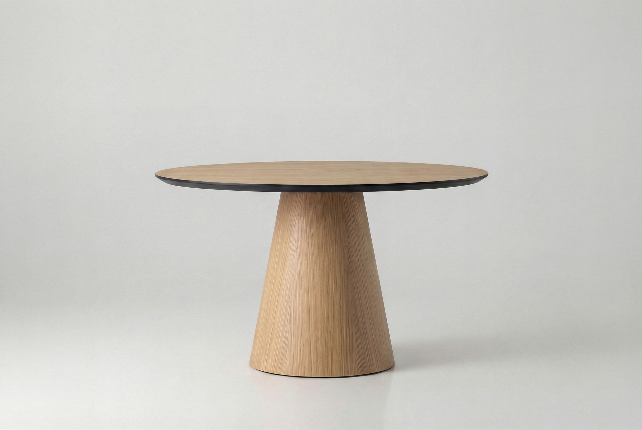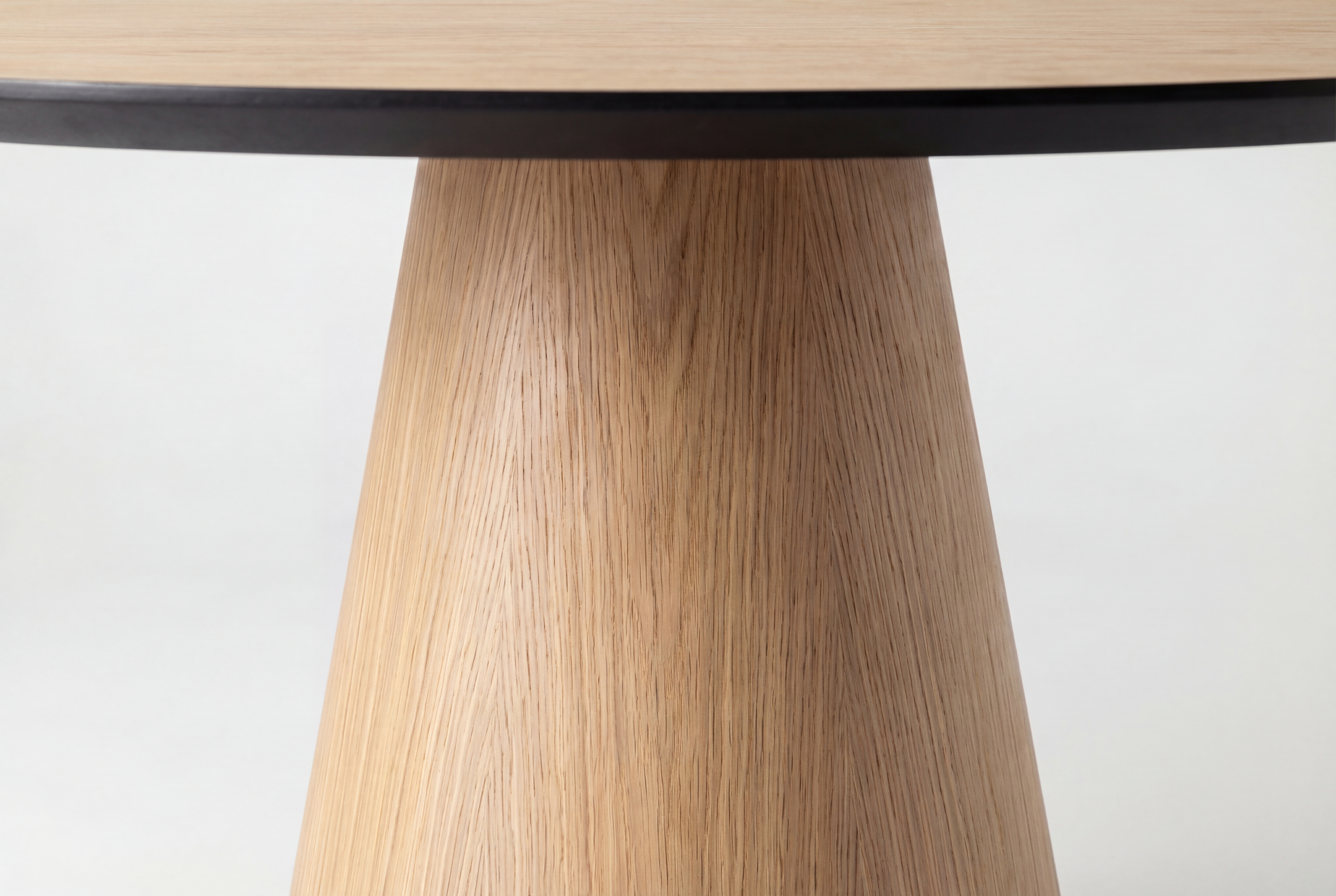 Стиль: Форма конуса визуально занимает меньше места, чем массивные тумбы, оставляя пространство для ног сидящих. Она перекликается с той же легкостью, что и торец 45°. При этом ножка также отделана шпоном дуба, создавая единение со столешницей.